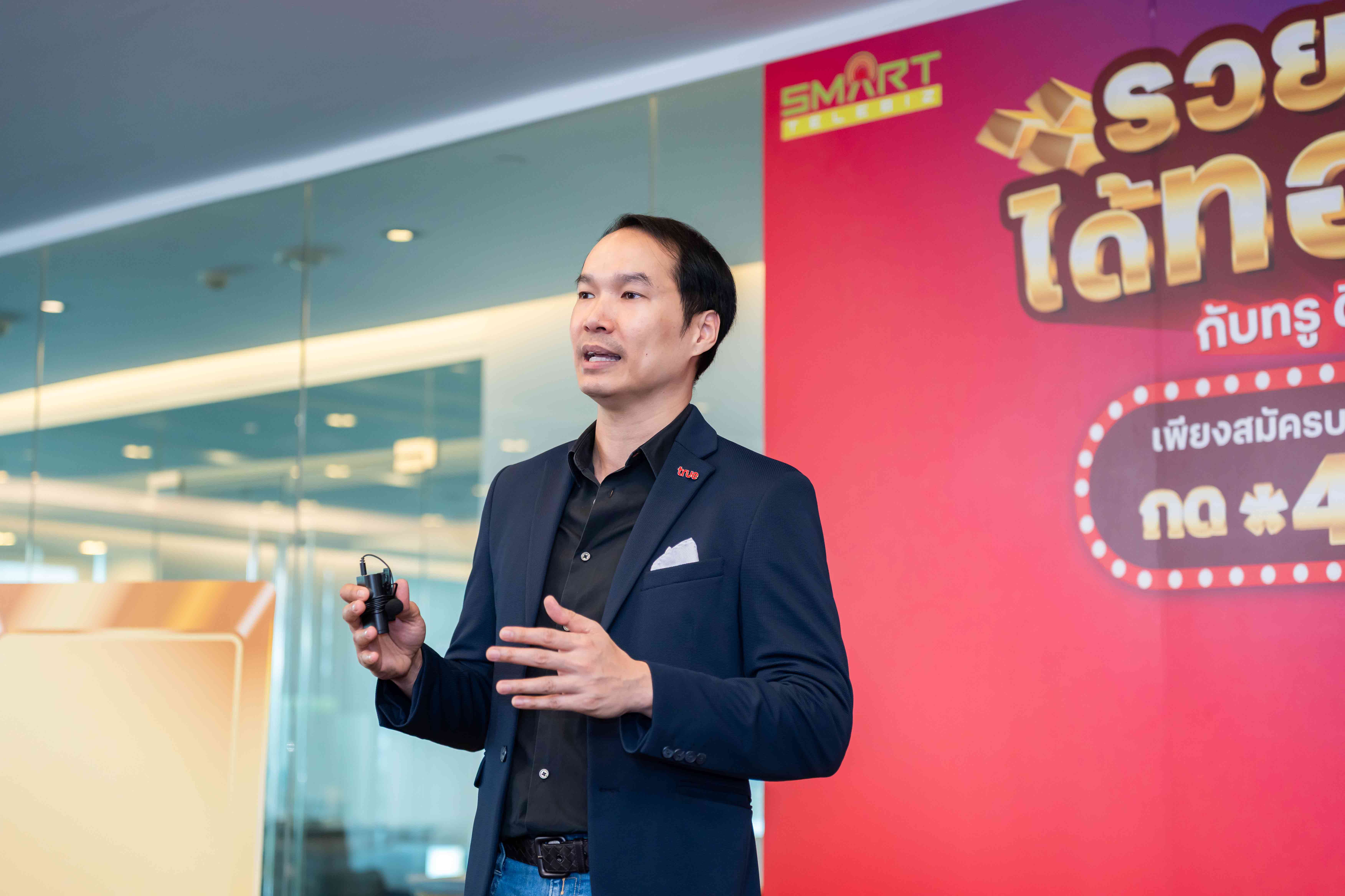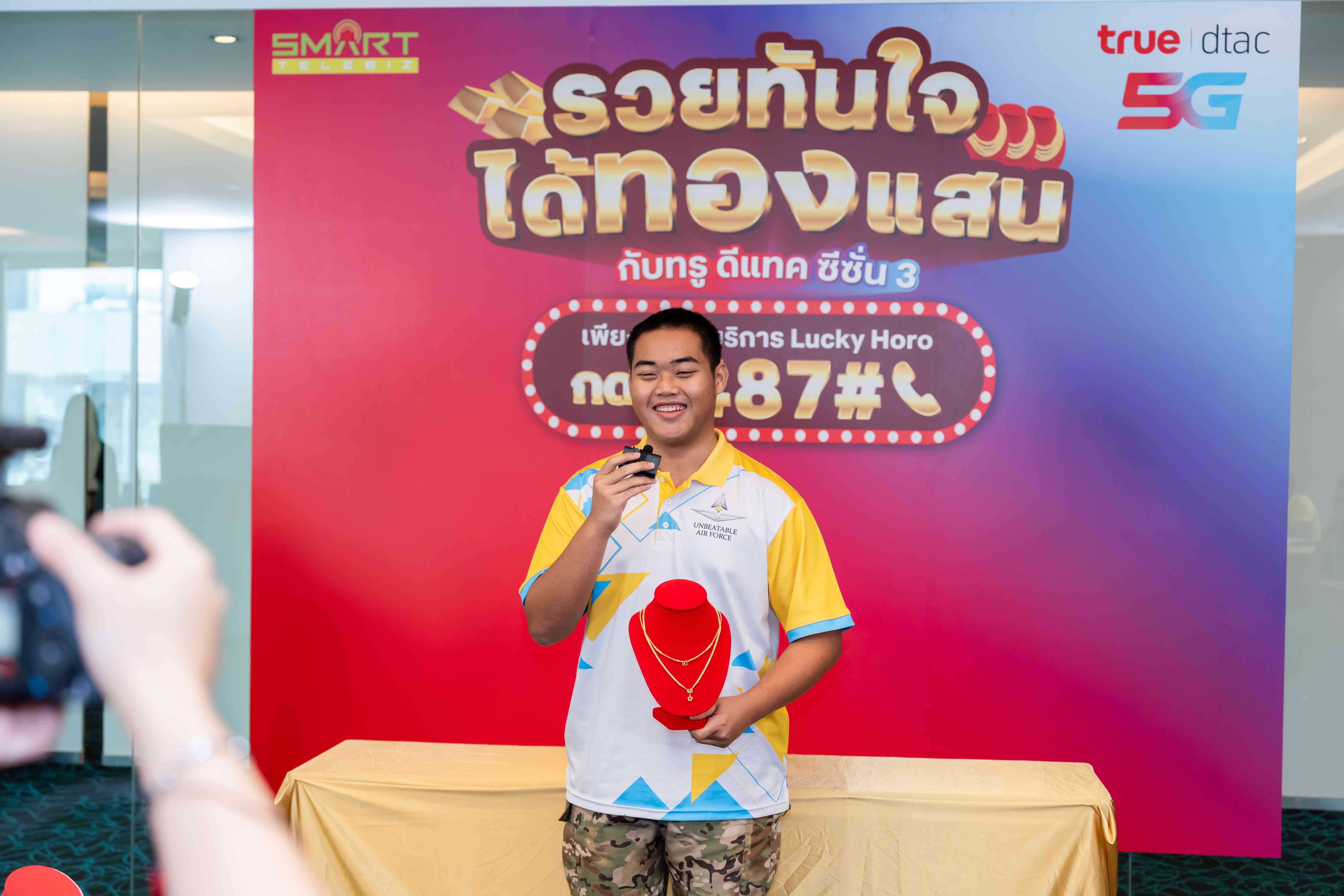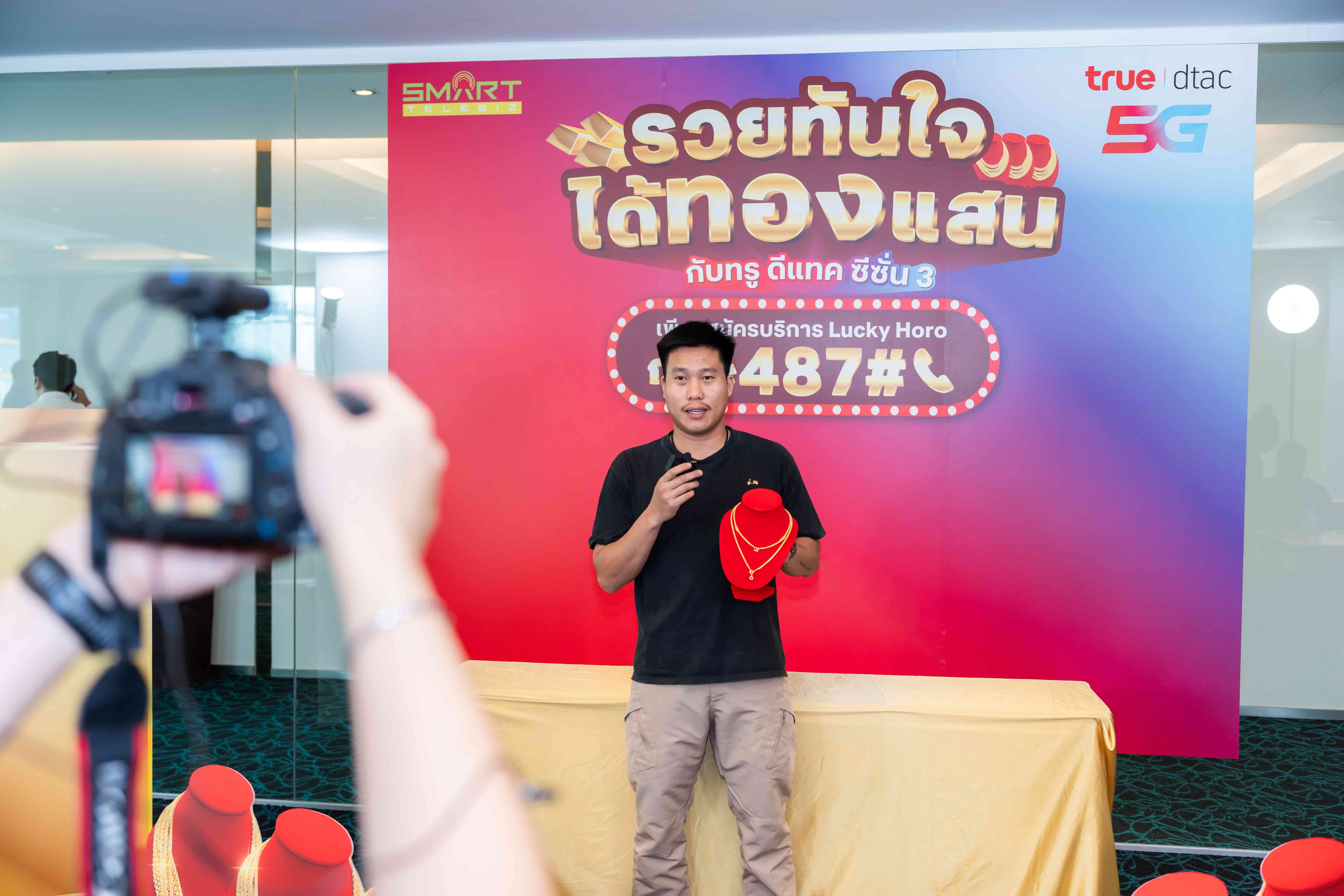 คุณภูริโชติ วงศ์โกมลเชษฐ์ หัวหน้าฝ่ายบริการดิจิทัล กล่าวว่า “รวยทันใจได้ทองแสน กับทรู ดีแทค ซีซั่น 3 นั้นเราแจกหนัก แจกจริง ซึ่งทรู ดีแทค ได้ร่วมกับบริษัท สมาร์ท เทเลบิซ แจกจริงมาเป็นเวลา 10 กว่าปีแล้ว วิธีการสมัครง่ายๆ แค่กดรับบริการ Lucky Horo ทุกคนก็สามารถได้สิทธิ์ลุ้นโชคทอง วันนี้เรามีการแจก 5 รางวัล ซึ่งมีผู้โชคดีเข้ามาร่วมรายการแจกรางวัลในวันนี้ด้วย”
